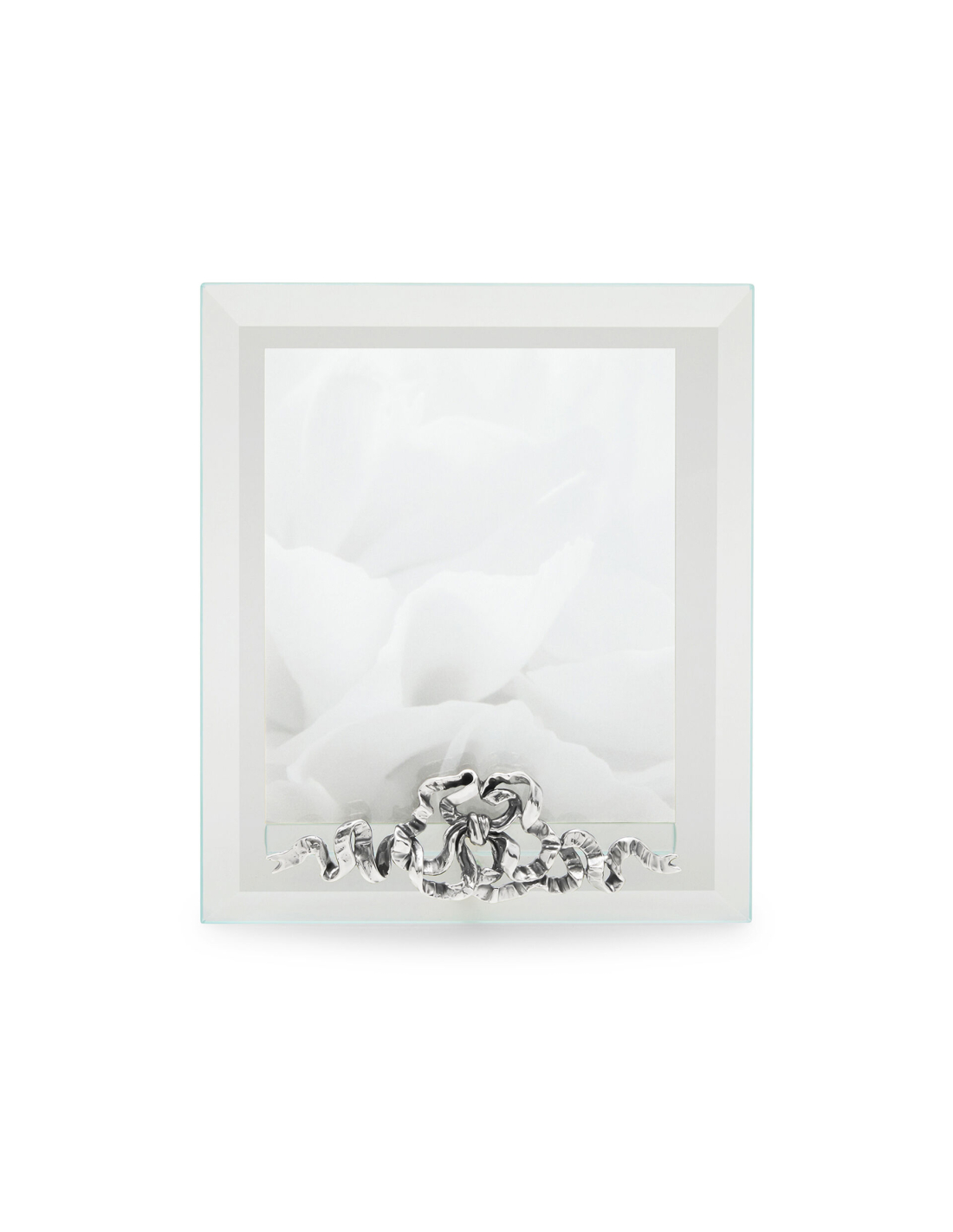 Un grande "nodo d'amore" in argento rende unica questa cornice caratterizzata dalla grande luminosità dei bordi in vetro trasparente. Il romantico ed elegante decoro posto al centro, è realizzato a mano con l'antica tecnica della fusione a cera persa e successiva brunitura.