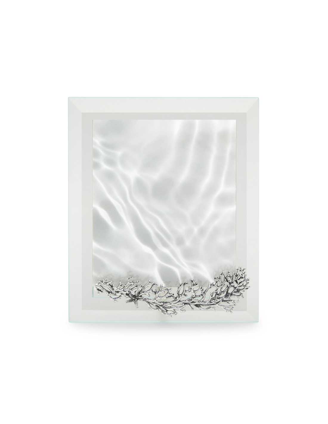 Un bellissimo decoro di coralli in argento rende unica questa cornice caratterizzata dalla grande luminosità dei bordi in vetro trasparente. Il decoro marino, posto con delicata eleganza sul lato inferiore, viene realizzato a mano con l'antica tecnica della fusione a cera persa e successiva brunitura.