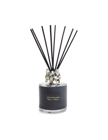 L' elegante profumatore d'ambiente "Farfalle" incontra la fragranza "Nero Divino". Il prezioso decoro è realizzato in bronzobianco, lega pregiata di bronzo sviluppata dall’azienda per la linea casa, dai toni simili all’argento e con caldi riflessi. La fragranza ha un dolce e raffinato profumo di uva fragola accompagnato dalla vivacità della mora e della fragolina di bosco con sfumature di cuoio e legno di cedro.