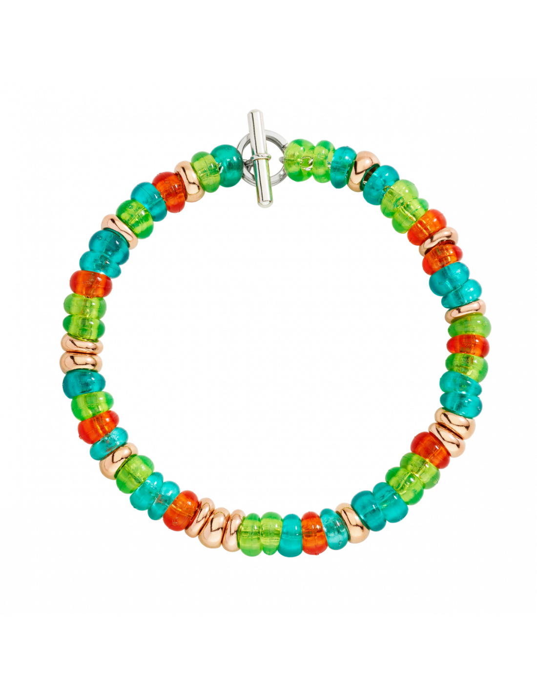 Bracciale Rondelle in argento dorato oro rosa 18K e plastica riciclata, catena e t-bar in argento 925 e anello brisé in acciaio.