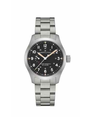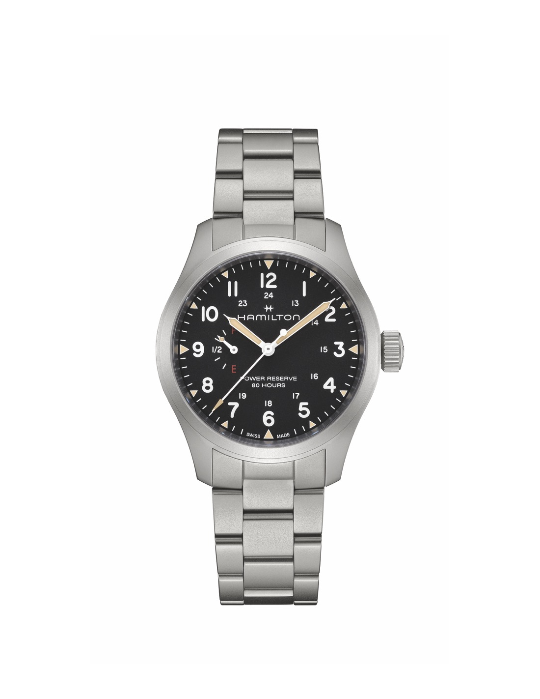 Il Khaki Field Mechanical Power Reserve 40 mm rende omaggio al design tradizionale e alla funzionalità essenziale della famiglia Khaki, introducendo al contempo caratteristiche moderne e le ultime novità in fatto di tecnologia e innovazione orologiere. Dotato di un nuovo movimento a carica manuale H-23, sviluppato da ETA in esclusiva per Hamilton, consente per la prima volta di visualizzare direttamente sul quadrante la riserva di carica di 80 ore. Dotato di un bracciale in acciaio, il quadrante nero mostra le diciture “power reserve 80 hours” (“riserva di carica di 80 ore”), “F” (completamente carico) ed “E” (scarico), sottolineando questa caratteristica funzionale d’eccezione.