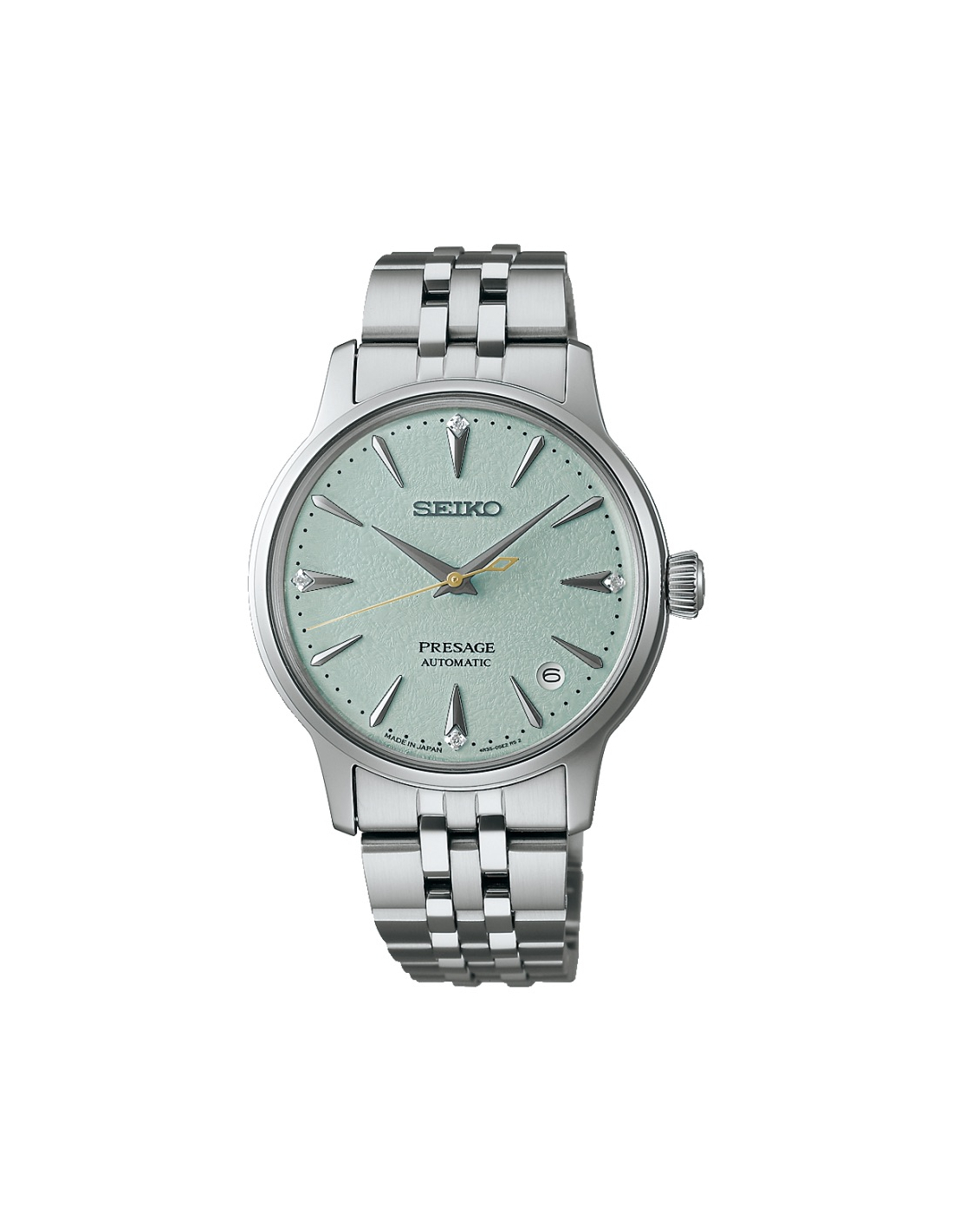 Il modello SRPL63J1 cattura lo spirito rinfrescante del Frozen Mojito con un delicato quadrante verde chiaro dai riflessi ghiacciati e quattro diamanti incastonati. Leggero, luminoso e perfetto per l’estate, questo orologio abbina freschezza e raffinatezza in un design da 34 mm.