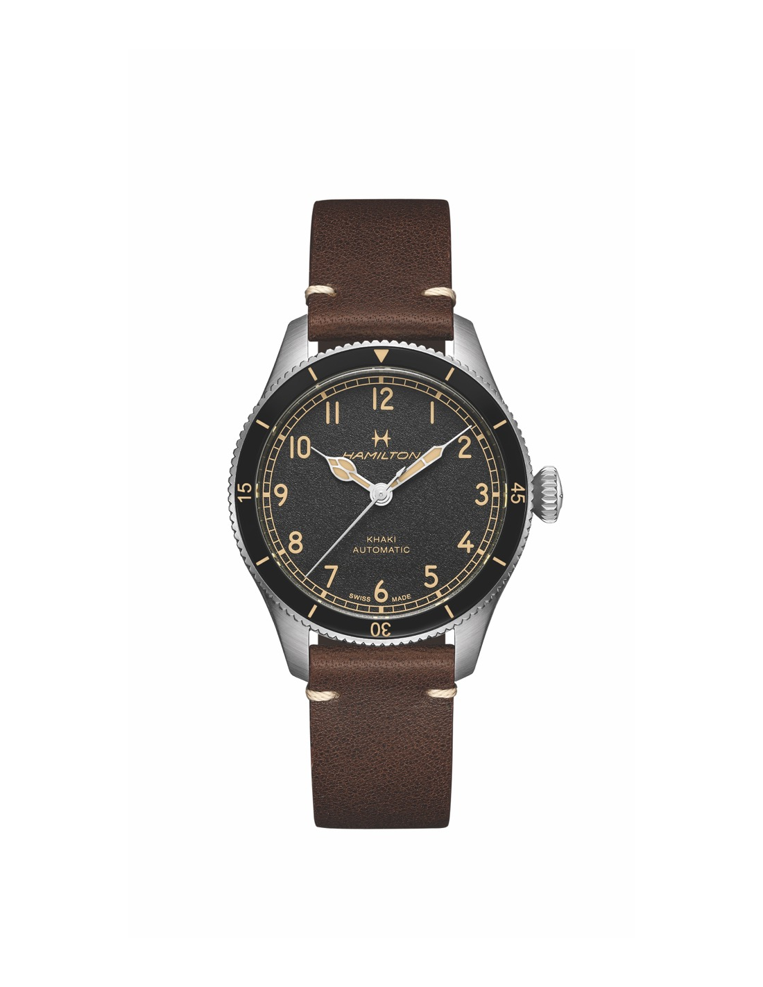 Traendo ispirazione dal Model 23, avanguardistico orologio da tasca usato dai soldati statunitensi durante la Seconda Guerra Mondiale, il design caratteristico del Khaki Aviation Pilot Pioneer è un tributo al legame di Hamilton con l’aviazione e alla sua tradizione militare. Con numeri ultra leggibili, lancette a cattedrale e una minuteria a binario esterna, questo orologio automatico da pilota da 38mm presenta un carattere sportivo ma raffinato allo stesso tempo.