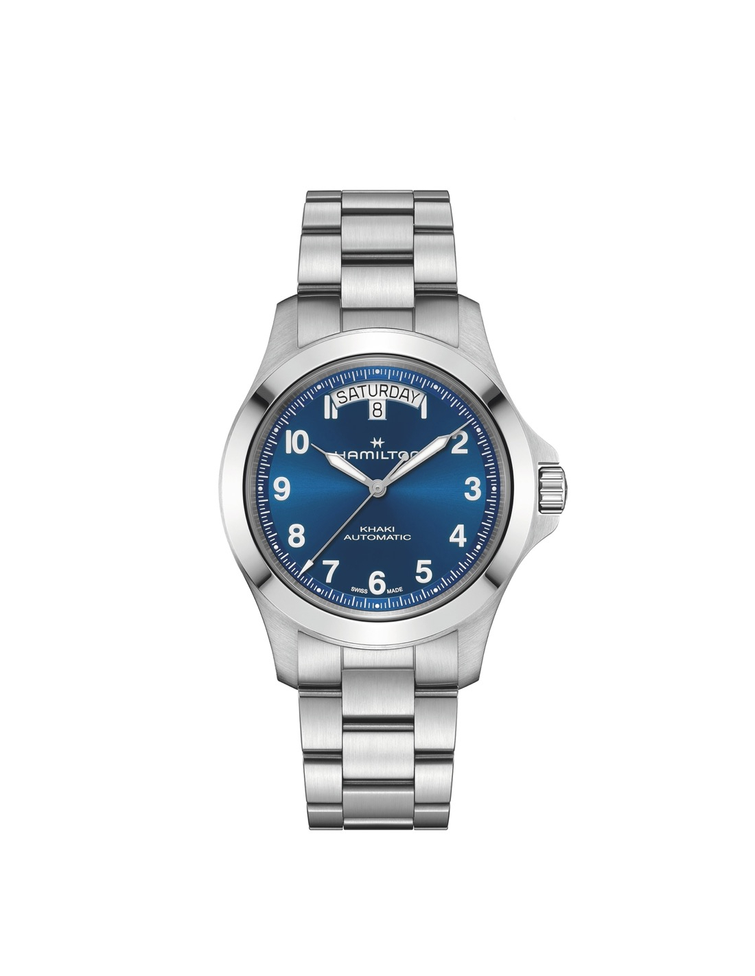 Robusto ma raffinato, il Khaki Field King 40 mm reinterpreta un’icona militare pensata per il tempo libero. Il quadrante blu spazzolato con finitura soleil presenta numeri arabi ben definiti e la caratteristica indicazione del giorno e della data a ore 12, incorniciati da una cassa e un bracciale in acciaio spazzolato con regolazione EasyClick. Con un’impermeabilità fino a 10 bar e dotato di un vetro zaffiro antiriflesso, questo orologio militare garantisce una resistenza superiore e massima leggibilità all’aperto in ogni condizione. Un classico moderno pensato per il tempo libero, con un’anima tradizionale.